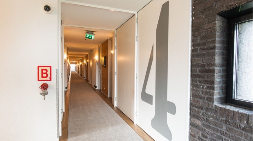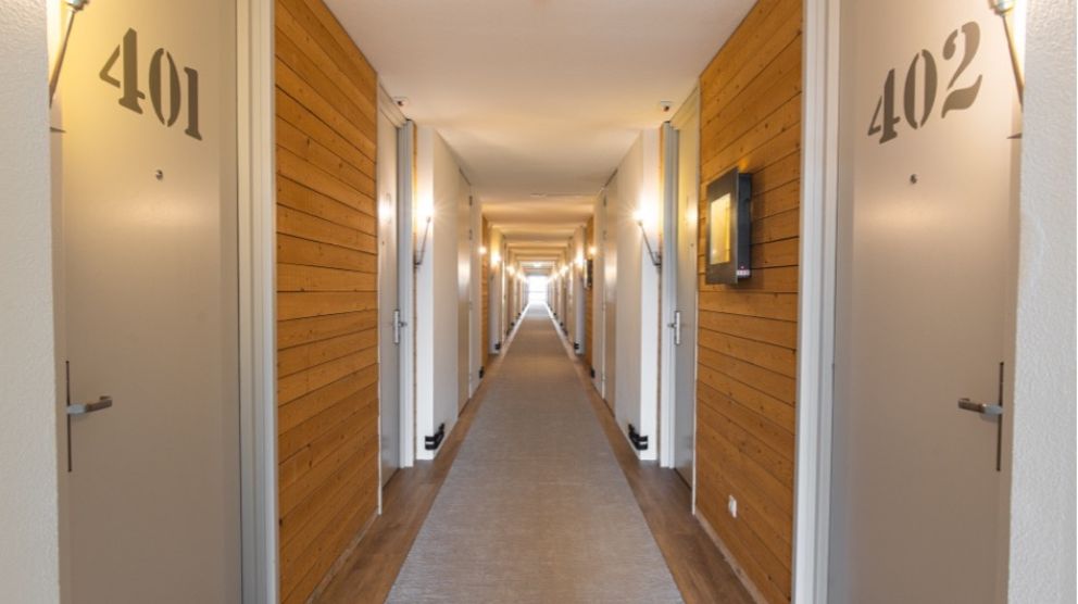 We haalden alle vloerbedekking eruit. Daarna schuurden en egaliseerden we de vloeren. Daaroverheen legden we een pvc-vloer met houtstructuur. Onder elk bed plaatsten we een karpet. In de gangen legden we lopertapijt met pvc aan weerszijden. We leverden 50 hotelkamers per week op.